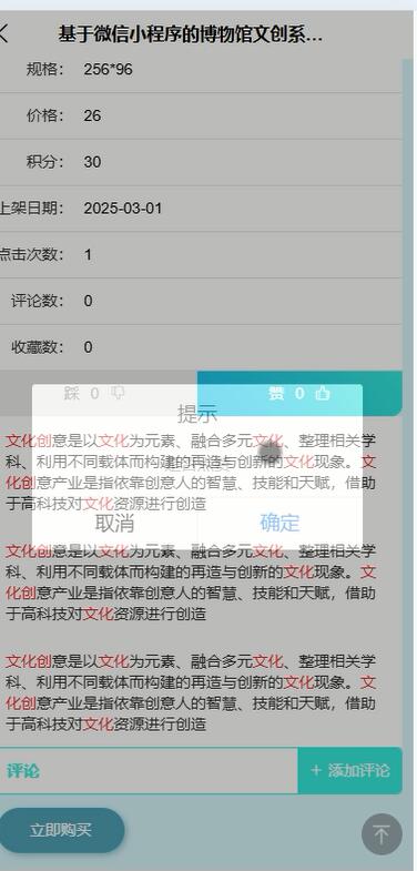随着文化消费的兴起,博物馆文创产业蓬勃发展,基于微信小工具的博物馆文创系统应运而生,旨在通过数字化手段提升文创产品的传播与销售,丰富公众的文化体验。该系统采用微信小应用作为前端展示平台,结合Java语言、Spring Boot框架和MySQL数据库进行后端开发,构建了一个高效、便捷且功能丰富的文创互动平台。
