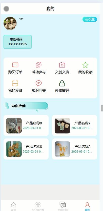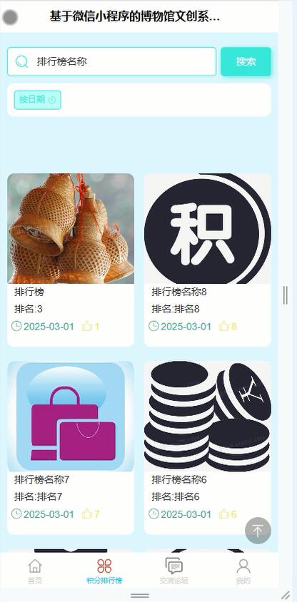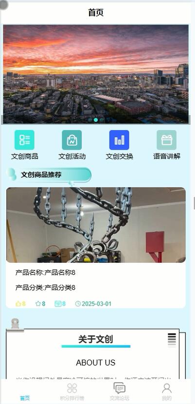 系统的核心效果包括文创商品展示与销售,用户可以浏览各类文创产品,了解产品详情并进行在线购买。文创活动模块则定期发布博物馆的展览活动、文创设计比赛等,吸引用户参与。文创交换功能允许用户之间进行文创产品的交换,促进文化共享。语音讲解模块为用户提供展品的详细语音介绍,增强参观体验。积分排行榜通过设置积分奖励机制,鼓励用户参与互动,提升用户粘性。交流论坛则为用户提供了一个交流文创心得、分享参观体验的平台。通过这些作用的有机结合,博物馆文创环境不仅提升了文创产品的传播力和影响力,还为公众提供了一个全方位的文化互动空间,推动了博物馆文创产业的发展。