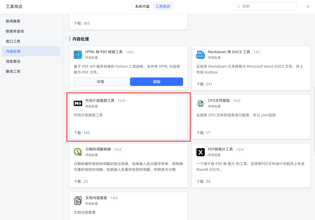 ①创建代码片段提取工具。我们搭建的智能体需要使用它从markdown格式的文本里提取json数据。在MaxKB工具页面,选择从工具商店创建,在工具商店菜单中的内容处理下面选择代码片段提取工具进行添加。