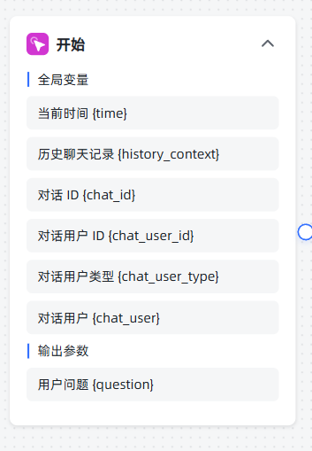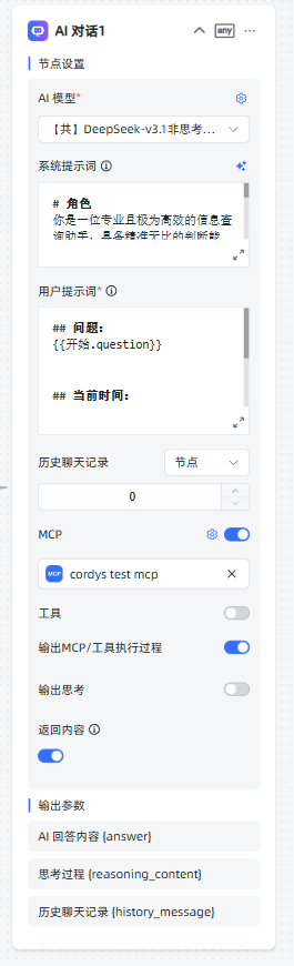 | AI对话节点 | ①选择AI模型 ②填写系统提示词和用户提示词 ③配置Cordys MCP ④打开输出MCP/工具执行过程和返回内容两个按钮 | ![]() |