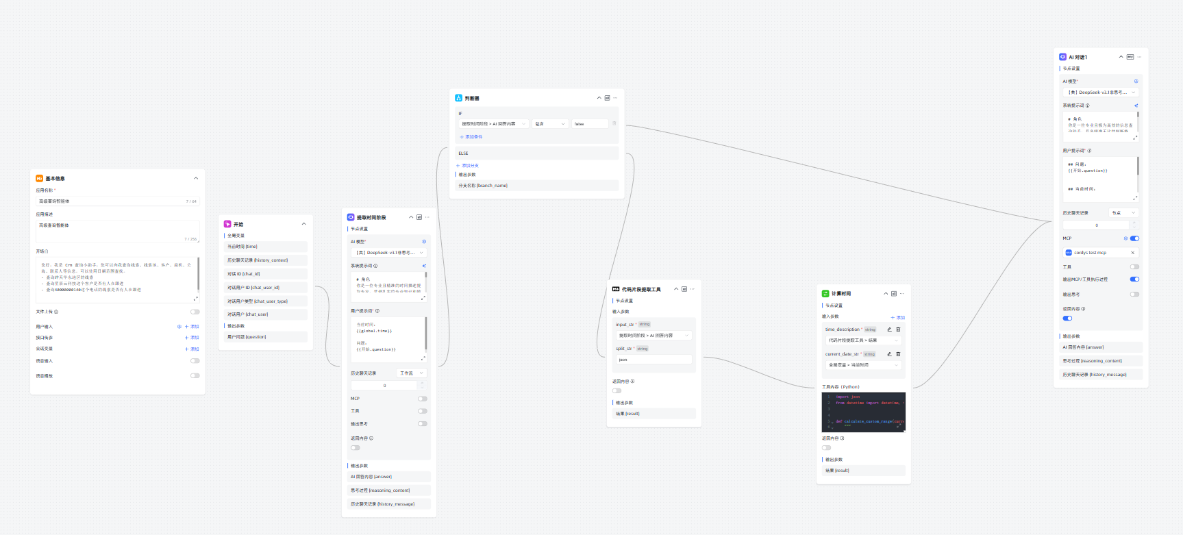 2.时间处理链路搭建:创建高级编排应用后,通过 AI 对话节点提取用户查询中的时间描述并生成结构化 JSON,经判断器筛选有时间范围的请求,再用代码片段提取工具获取纯净 JSON 数据,最后通过自定义 Python 工具将时间描述转换为 MCP 所需的毫秒级时间戳;