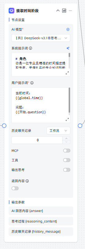 ④添加AI对话节点,修改节点名称:提取时间阶段,选择AI模型,填写系统提示词,