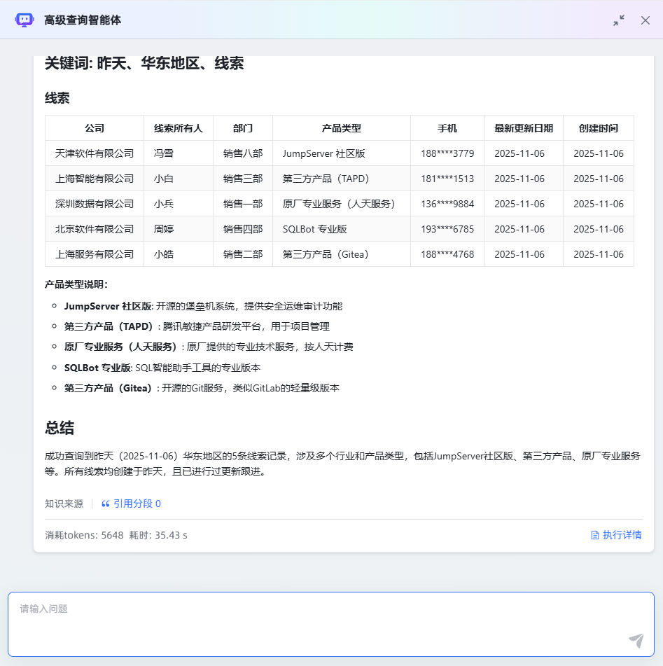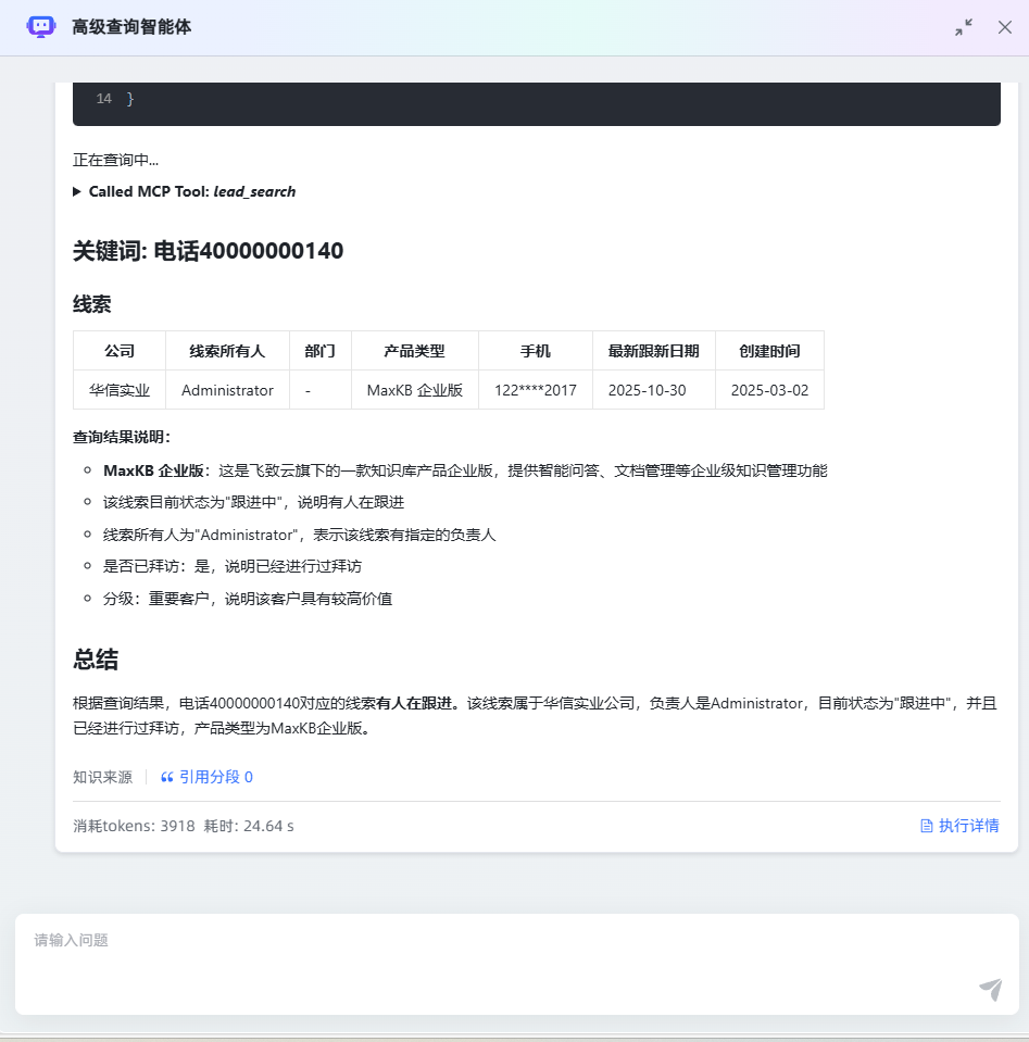 Cordys CRM 全局线索商机信息检索智能体,基于 MaxKB 平台搭建,核心实现了 “自然语言时间解析 - 标准化时间戳计算 - Cordys MCP 服务调用 - 多场景查询反馈” 的全流程自动化。智能体不仅支持多样化查询场景,还简化了操作门槛,无需手动配置时间参数与 MCP 调用细节,即可快速获取准确的线索商机与客户跟进信息,为 CRM 用户节省大量操作时间,提升工作效率与数据查询准确性。