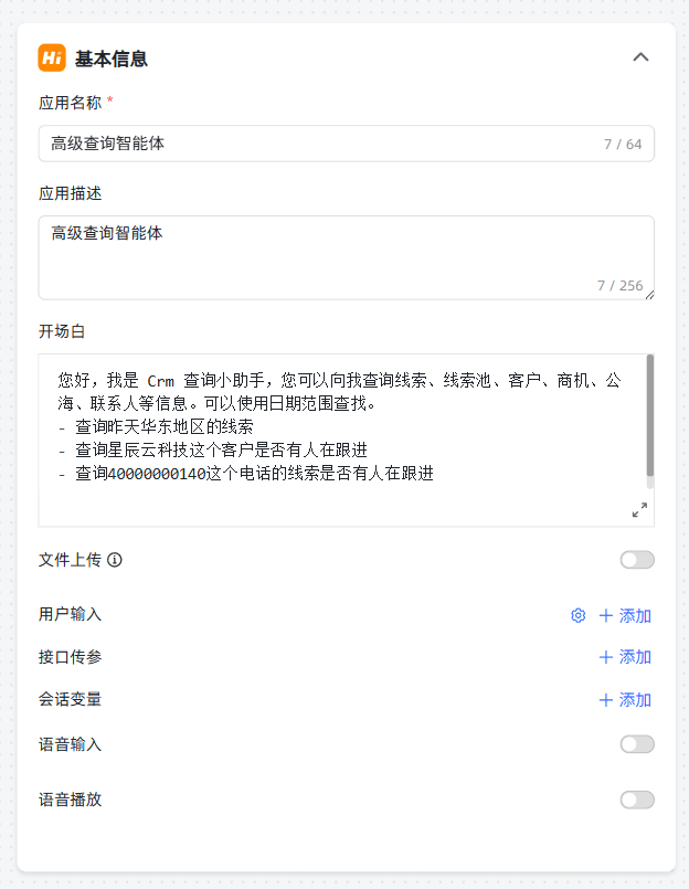 ③创建高级编排应用,在基本信息中修改名称、描述以及开场白: