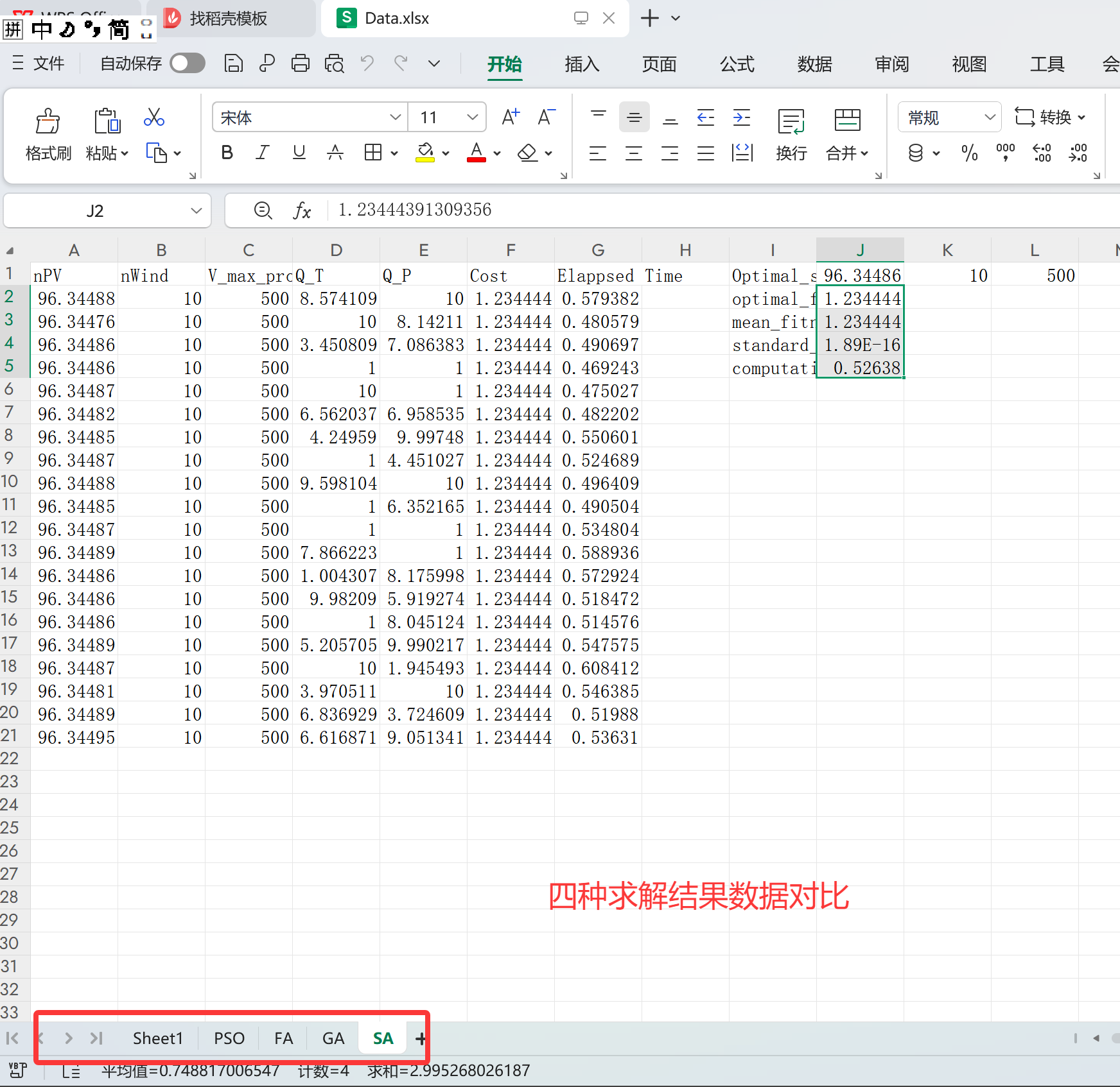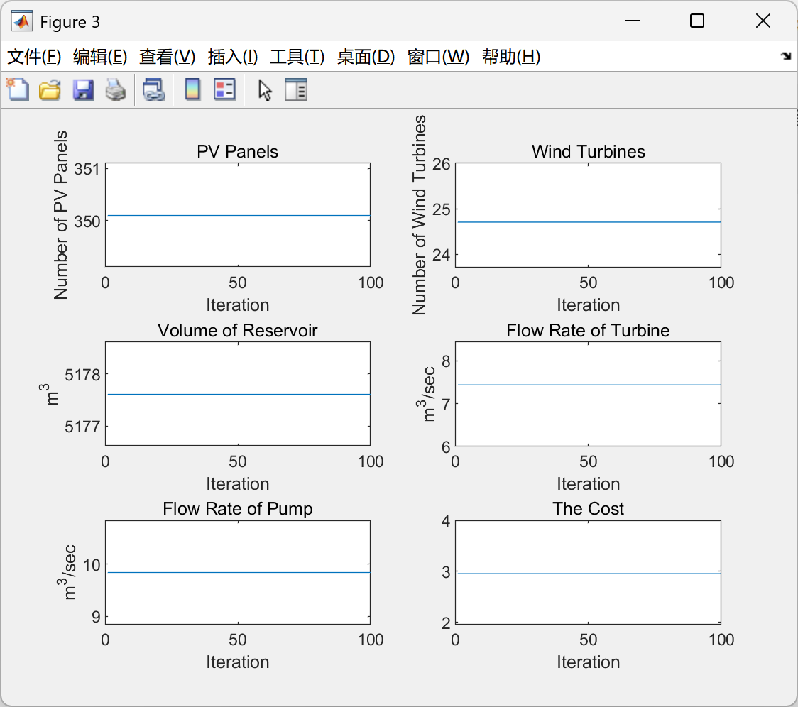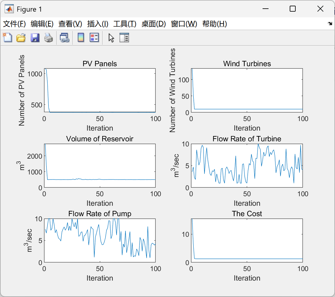 在满足运行约束的前提下,最小化混合系统的能源成本,约束条件包括:混合供电的高可靠性、注入电网功率波动小、充分利用光伏与风能的互补特性。本文利用 MATLAB 软件包评估各优化算法求解该优化挑战的表现。就是摘要——凭借采用混合发电环境,为国家供应清洁、可靠且可负担的能源,对建立可持续发展目标至关重要。本文介绍了多种优化方式在光伏-风机-抽水蓄能混合系统容量安装中的应用结果。研究全面比较了模拟退火算法(SA)、遗传算法(GA)、粒子群算法(PSO)与萤火虫算法(FA)的性能,以验证各算法的有效性。优化目标
