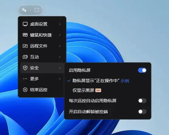 向日葵:供应基础的数据加密和身份验证措施,特性相对全面,但设置分布在不同的能力栏和页面中,需要用户主动配置。