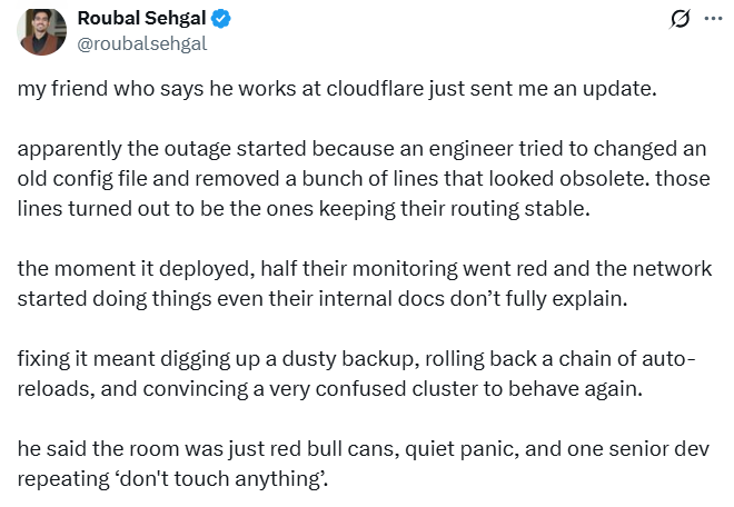 还有一位声称“朋友在 Cloudflare 工作”的人士表示,“宕机是因为有个工程师试图修改一份旧配置文件,删掉了一堆看起来已经过时的代码行。结果发现,正是这些代码行在维持着他们路由系统的稳定。配置文件一经部署,一半的监控系统直接变红报警,整个网络开始出现一些甚至他们内部文档都无法完全解释的异常现象。修复过程得找回一份尘封已久的备份,回滚一连串自动重载操作,还要想办法让一个彻底乱了套的服务器集群恢复正常运行。”