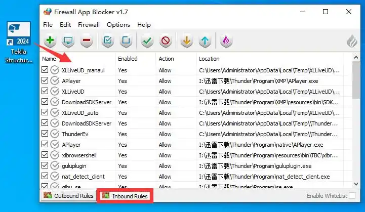14.①点击【Inbound Rules】按钮;②将桌面【Tekla Structures 2024】图标拖到软件界面
