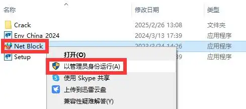 12.回到最开始解压出的文件夹,找到【Net Block】文件,鼠标右键,选择【以管理员身份运行】