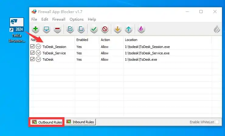 13.①点击【Outbound Rules】按钮;②将桌面【Tekla Structures 2024】图标拖到软件界面