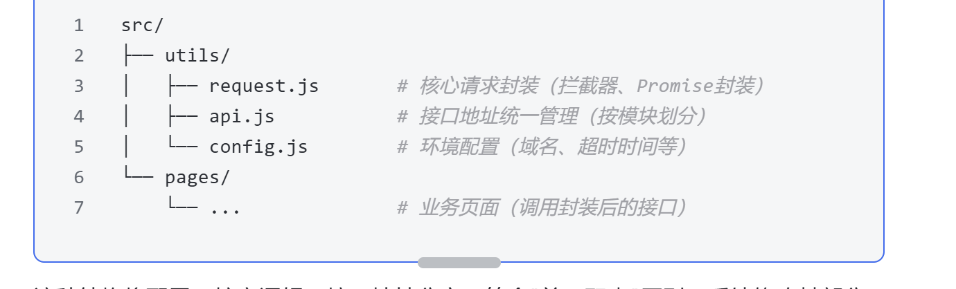 合理的目录结构是后续维护的基础,建议在项目src/utils文件夹下创建请求相关文件,结构如下: