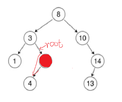 当递归到root为要删除的节点时,因为我们使用了指针引用,所以这个时候root是节点3的右指针引用,我们直接改变节点3的右指针的指向,指向为4即可。