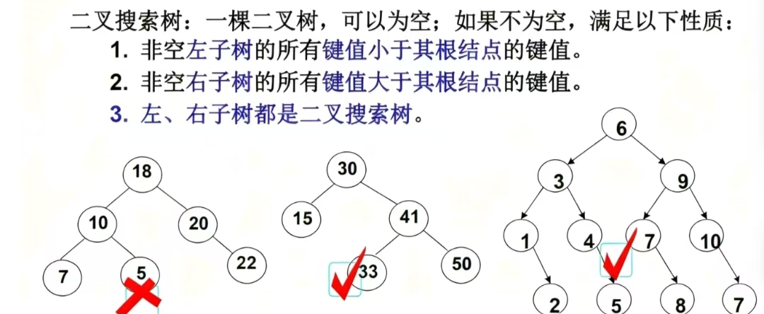 2. 查找高效:类似“二分查找”逻辑,每次比较可排除一半子树。若树平衡,查找、插入、删除操作时间复杂度为O(log n);若失衡(如退化为链表),则降为O(n)。