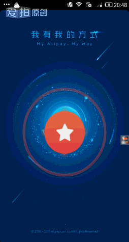 ①支付宝的背景图片是淡红色。衬托了红色的波纹。