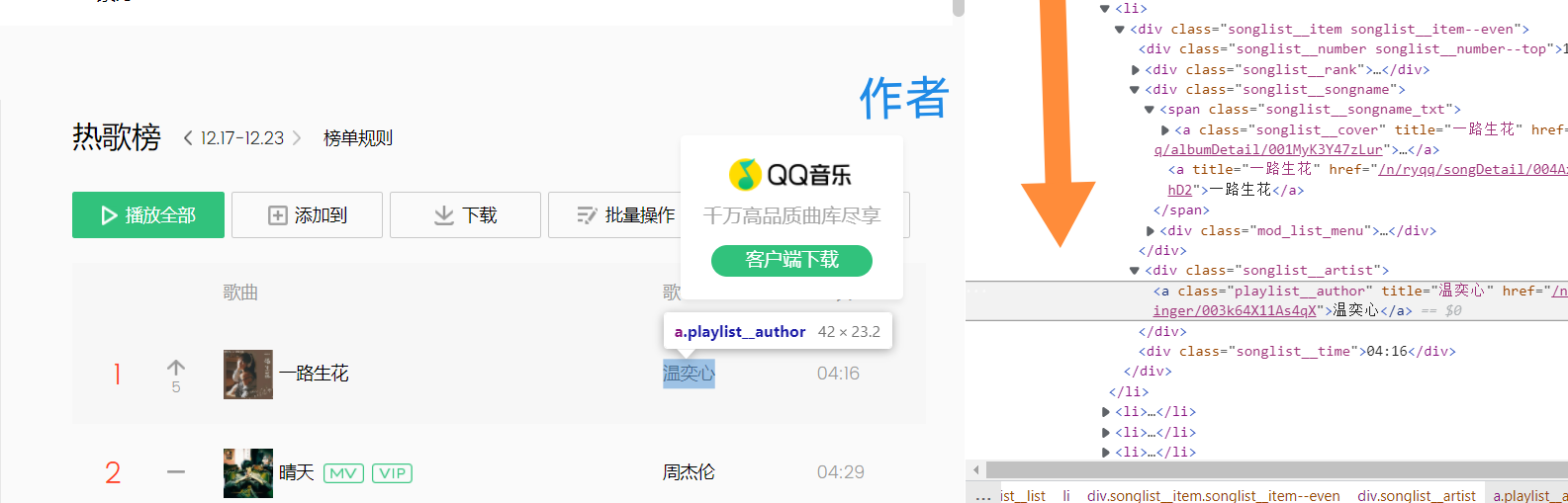 通过对页面结构的分析,发现<div class="main">元素中,发现所需要的数据。并进行查找,在标签<class="songlist_number">,<class="songlist_time">,<class="playlist_author">,<a>分别找到排名,时长,作者,歌名的数据。