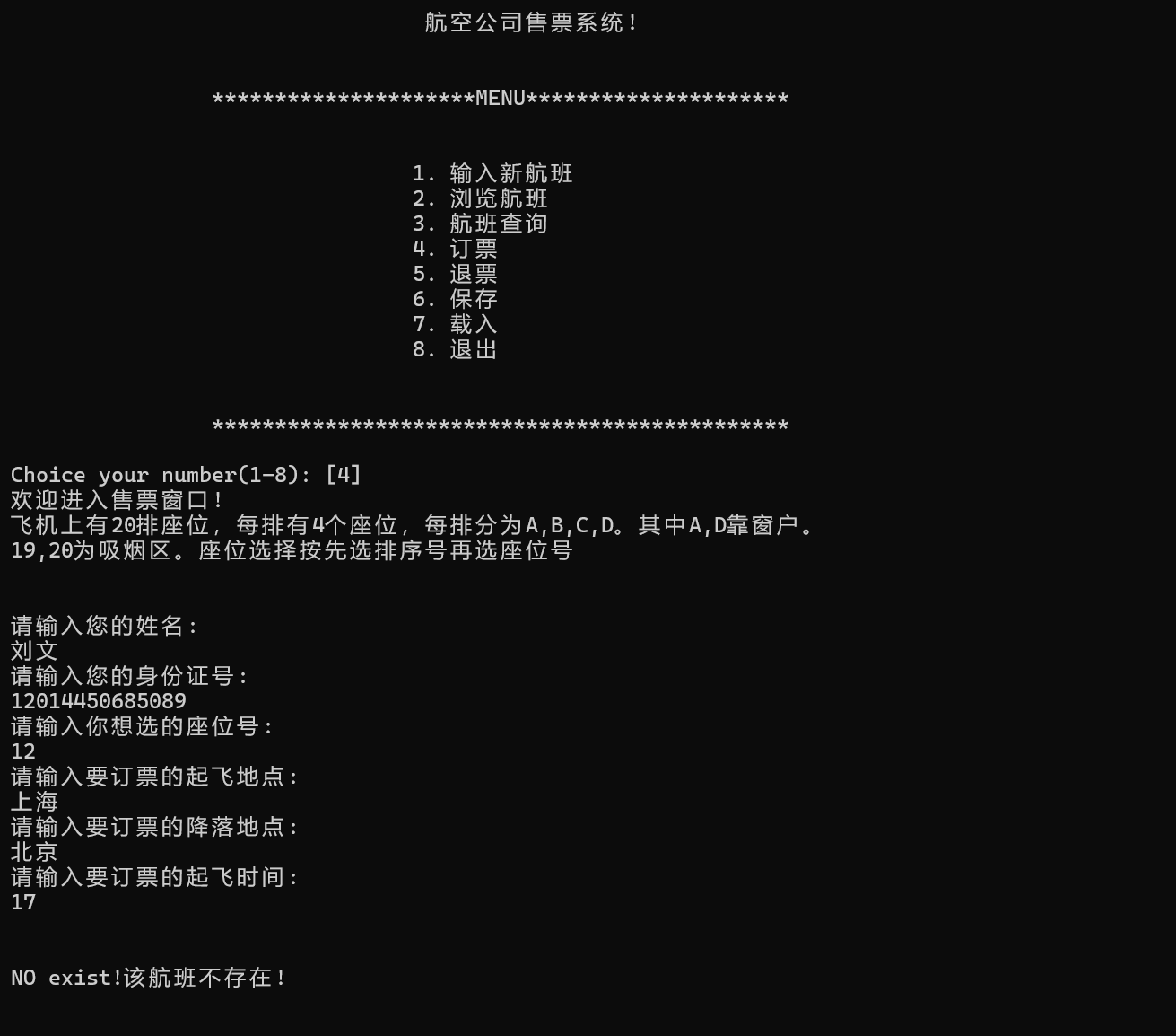printf("\n\t姓 名 身份证号 座位号 已买航班代号\n");