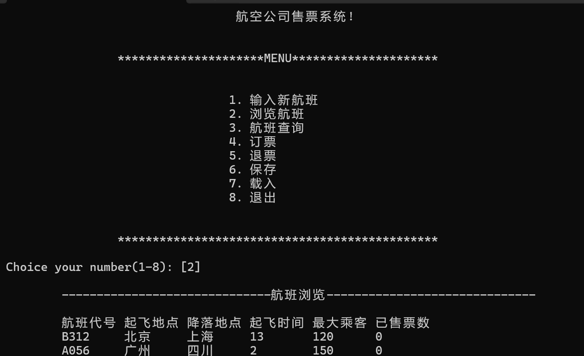 printf("\n\t航班代号 起飞地点 降落地点 起飞时间 最大乘客 已售票数\n");