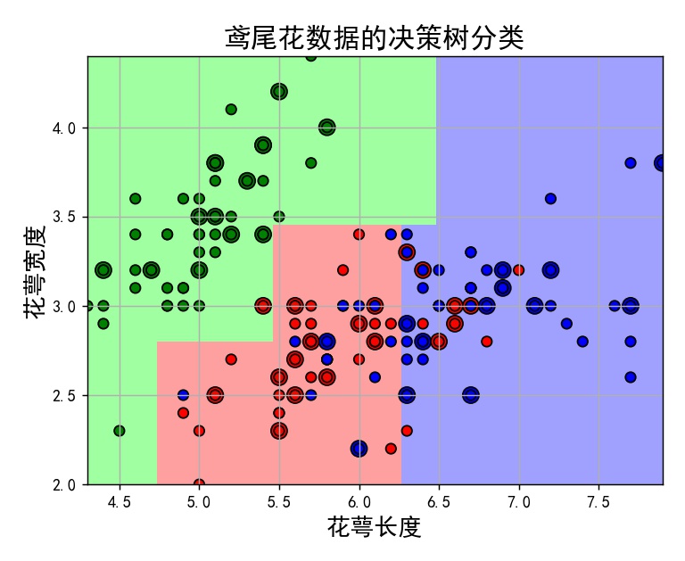 1 import numpy as np 2 from sklearn import datasets 3 from sklearn.model_selection import train_test_split 4 import matplotlib as mpl 5 import matplotlib.pyplot as plt 6 from sklearn import tree 7 from sklearn.pipeline import Pipeline 8 from sklearn.tree import DecisionTreeClassifier 9 from sklearn.preprocessing import StandardScaler 10 11 # 防止画图汉字乱码 12 mpl.rcParams['font.sans-serif'] = [u'SimHei'] 13 mpl.rcParams['axes.unicode_minus'] = False 14 15 #数据准备 16 dataset = datasets.load_iris() # 此时 训练数据(train)与标签(target) 已经分离 为 字典 数据集 17 # 数据集 已经将标签数据化(化为0-2标签值) 无需再处理 18 19 data = dataset['data'] # 取出对应键 的值 值为array类型 20 target = dataset['target'] 21 # input = torch.FloatTensor(dataset['data']) 22 # y = torch.LongTensor(dataset['target']) 23 24 x = np.array(data) 25 y = np.array(target) 26 x = x[:, :2] # 此时的数据为 150行 4列 为方便画图 我们只取前两个特征 27 # 将数据集 7 / 3 分 28 x_train, x_test, y_train, y_test = train_test_split(x, y, test_size=0.3, random_state=1) 29 30 model = Pipeline([ 31 ('ss', StandardScaler()), 32 ('DTC', DecisionTreeClassifier(criterion='entropy', max_depth=3))]) 33 # clf = DecisionTreeClassifier(criterion='entropy', max_depth=3) 34 model = model.fit(x_train, y_train) 35 y_test_hat = model.predict(x_test) # 测试数据 y_test_hat 为预测值 36 # print(y_test) 45个预测样本的真实标签 37 # [0 1 1 0 2 1 2 0 0 2 1 0 2 1 1 0 1 1 0 0 1 1 1 0 2 1 0 0 1 2 1 2 1 2 2 0 1 0 1 2 2 0 2 2 1] 38 # print(y_test_hat) 45个预测样本的预测标签 39 # [0 1 2 0 2 2 2 0 0 2 1 0 2 2 1 0 1 1 0 0 1 0 2 0 2 1 0 0 1 2 1 2 1 2 1 0 1 0 2 2 2 0 1 2 2] 40 41 42 # 保存 43 # dot -Tpng -o 1.png 1.dot 44 f = open('.\\iris_tree.dot', 'w') 45 tree.export_graphviz(model.get_params('DTC')['DTC'], out_file=f) 46 47 # 画图 48 N, M = 100, 100 # 横纵各采样多少个值 49 x1_min, x1_max = x[:, 0].min(), x[:, 0].max() # 第0列的范围 50 x2_min, x2_max = x[:, 1].min(), x[:, 1].max() # 第1列的范围 51 t1 = np.linspace(x1_min, x1_max, N) 52 t2 = np.linspace(x2_min, x2_max, M) 53 x1, x2 = np.meshgrid(t1, t2) # 生成 v 网格采样点 54 x_show = np.stack((x1.flat, x2.flat), axis=1) # 测试点 55 56 # # 无意义,只是为了凑另外两个维度 57 # # 打开该注释前,确保注释掉x = x[:, :2] 58 # x3 = np.ones(x1.size) * np.average(x[:, 2]) 59 # x4 = np.ones(x1.size) * np.average(x[:, 3]) 60 # x_test = np.stack((x1.flat, x2.flat, x3, x4), axis=1) # 测试点 61 62 cm_light = mpl.colors.ListedColormap(['#A0FFA0', '#FFA0A0', '#A0A0FF']) 63 cm_dark = mpl.colors.ListedColormap(['g', 'r', 'b']) 64 y_show_hat = model.predict(x_show) # 预测值 预测的标签值 65 66 y_show_hat = y_show_hat.reshape(x1.shape) # 使之与输入的形状相同 67 plt.figure(facecolor='w') 68 plt.pcolormesh(x1, x2, y_show_hat, cmap=cm_light) # 预测值的显示 69 plt.scatter(x_test[:, 0], x_test[:, 1], c=y_test.ravel(), edgecolors='k', s=100, cmap=cm_dark, marker='o') # 测试数据 70 plt.scatter(x[:, 0], x[:, 1], c=y.ravel(), edgecolors='k', s=40, cmap=cm_dark) # 全部数据 71 plt.xlabel("花萼长度", fontsize=15) # 花萼长度、花萼宽度 72 plt.ylabel("花萼宽度", fontsize=15) 73 plt.xlim(x1_min, x1_max) 74 plt.ylim(x2_min, x2_max) 75 plt.grid(True) 76 plt.title(u'鸢尾花数据的决策树分类', fontsize=17) 77 plt.show() 78 79 # 训练集上的预测结果 80 y_test = y_test.reshape(-1) 81 82 result = (y_test_hat == y_test) # True则预测正确,False则预测错误 83 acc = np.mean(result) 84 print('准确度: %.2f%%' % (100 * acc)) 85 86 # 过拟合:错误率 87 depth = np.arange(1, 45) 88 err_list = [] 89 for d in depth: # 进行15 90 clf = DecisionTreeClassifier(criterion='entropy', max_depth=d) 91 clf = clf.fit(x_train, y_train) 92 y_test_hat = clf.predict(x_test) # 测试数据 93 result = (y_test_hat == y_test) # True则预测正确,False则预测错误 94 err = 1 - np.mean(result) 95 err_list.append(err) 96 print(d, ' 准确度: %.2f%%' % (100 * err)) 97 plt.figure(facecolor='w') 98 plt.plot(depth, err_list, 'ro-', lw=2) 99 plt.xlabel(u'决策树深度', fontsize=15) 100 plt.ylabel(u'错误率', fontsize=15) 101 plt.title(u'决策树深度与过拟合', fontsize=17) 102 plt.grid(True) 103 104 plt.show() 105 106 from sklearn import tree # 需要导入的包 107 108 f = open('D:\\py_project\\iris_tree.dot', 'w') 109 110 tree.export_graphviz(model.get_params('DTC')['DTC'], out_file=f)