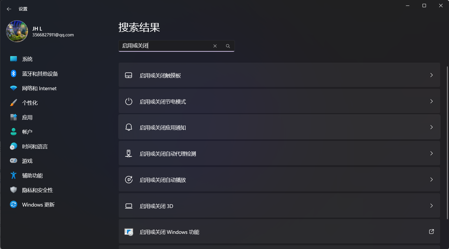 在左上角查找设置中搜索“启用或关闭”,选择“启用或关闭Windows功能”