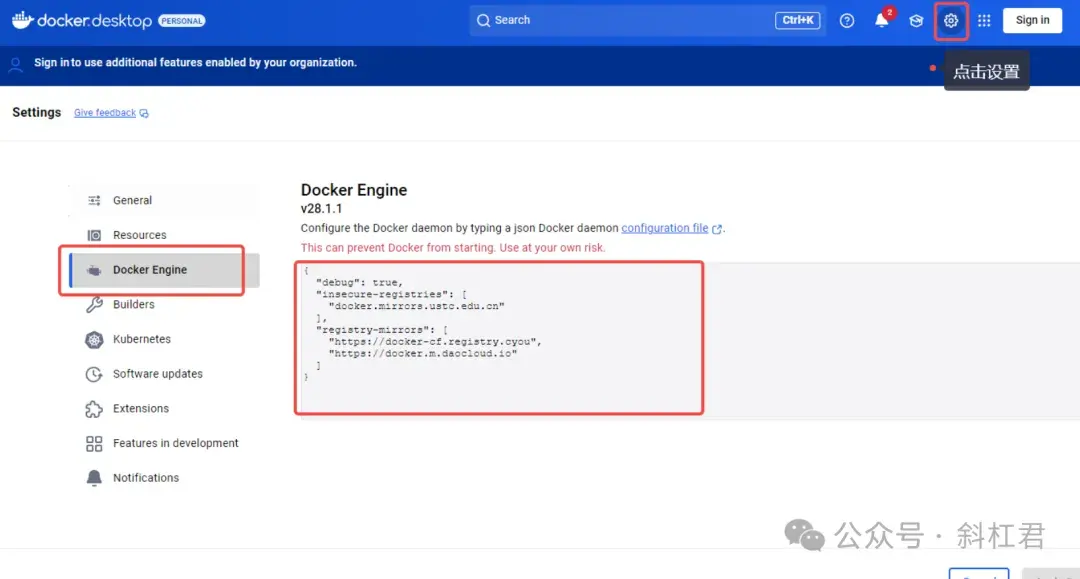 接下来就是比较关键的步骤,在安装Dify之前,我们要先进行Docker中镜像网站的设置,因为默认的镜像是国外的网址,访问不到。所以我们要改成国内的,修改方式如下: