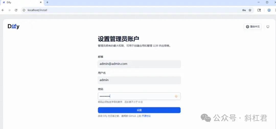 4. 初始化Dify后台,设置用户名和密码等,然后登录使用就可以了。