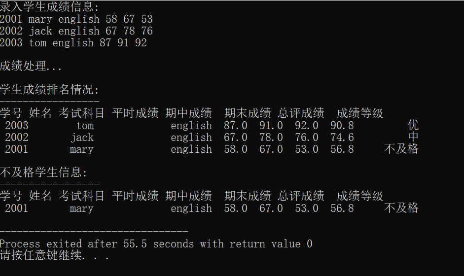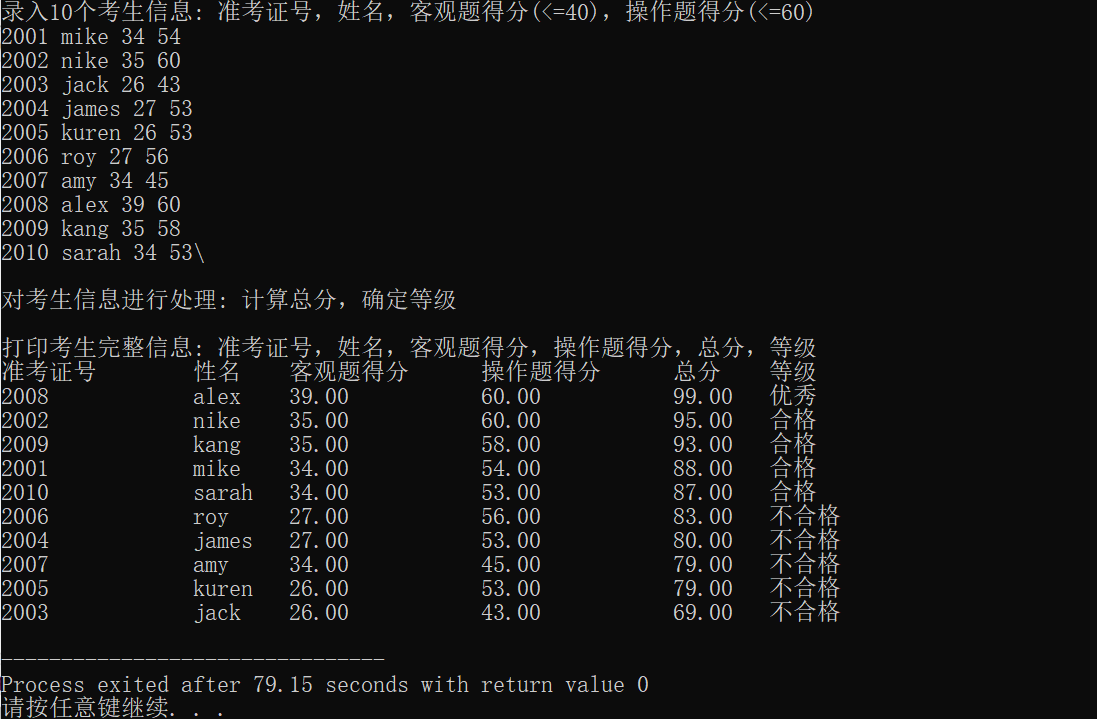 #include <stdio.h> #include <string.h> const int N = 10; // 定义结构体类型struct student,并定义其别名为STU typedef struct student { long int id; char name[20]; float objective; /*客观题得分*/ float subjective; /*操作题得分*/ float sum; char level[10]; }STU; // 函数声明 void input(STU s[], int n); void output(STU s[], int n); void process(STU s[], int n); int main() { STU stu[N]; printf("录入%d个考生信息: 准考证号,姓名,客观题得分(<=40),操作题得分(<=60)\n", N); input(stu, N); printf("\n对考生信息进行处理: 计算总分,确定等级\n"); process(stu, N); printf("\n打印考生完整信息: 准考证号,姓名,客观题得分,操作题得分,总分,等级\n"); output(stu, N); return 0; } // 录入考生信息:准考证号,姓名,客观题得分,操作题得分 void input(STU s[], int n) { int i; for(i=0;i<n;i++) { scanf("%ld %s %f %f",&s[i].id,s[i].name,&s[i].objective,&s[i].subjective); } } //输出考生完整信息: 准考证号,姓名,客观题得分,操作题得分,总分,等级 void output(STU s[], int n) { int i; printf("准考证号\t性名\t客观题得分\t操作题得分\t总分\t等级\n"); for(i=0;i<n;i++) { printf("%-8ld\t%-4s\t%-10.2f\t%-10.2f\t%-4.2f\t%-4s\n",s[i].id,s[i].name,s[i].objective,s[i].subjective,s[i].sum,s[i].level); } } // 对考生信息进行处理:计算总分,排序,确定等级 void process(STU s[], int n) { STU t; int i,j,k,p=0; k=0; for(i=0;i<n;i++) { s[i].sum=s[i].objective+s[i].subjective; } for(i=0;i<n;i++) { k=i; for(j=i+1;j<n;j++) { if(s[j].sum>s[k].sum) { k=j; } } t=s[i]; s[i]=s[k]; s[k]=t; } for(i=0;i<n;i++) { switch(10*(i)/n) { case 0:strcpy(s[i].level,"优秀");break; case 1: case 2: case 3: case 4:strcpy(s[i].level,"合格");break; case 5: case 6: case 7: case 8: case 9:strcpy(s[i].level,"不合格");break; default:break; } } }