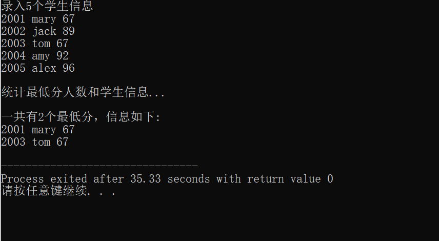 #include <stdio.h> const int N=5; // 定义结构体类型struct student,并定义STU为其别名 typedef struct student { long no; char name[20]; int score; }STU; // 函数声明 void input(STU s[], int n); int findMinlist(STU s[], STU t[], int n); void output(STU s[], int n); int main() { STU stu[N], minlist[N]; int count; printf("录入%d个学生信息\n", N); input(stu, N); printf("\n统计最低分人数和学生信息...\n"); count = findMinlist(stu, minlist, N); printf("\n一共有%d个最低分,信息如下:\n", count); output(minlist, count); return 0; } // 输入n个学生信息,存放在结构体数组s中 void input(STU s[], int n) { int i; for(i=0; i<n; i++) scanf("%ld %s %d", &s[i].no, s[i].name, &s[i].score); } // 输出结构体s中n个元素信息 void output(STU s[], int n) { int i; for(i=0; i<n; i++) printf("%ld %s %d\n", s[i].no, s[i].name, s[i].score); } // 在结构体数组s中,查找最低分学生的记录,将其存入结构体数组t中 // 形参n是结构体数组s中元素个数 // 函数返回最低分的学生人数 int findMinlist(STU s[], STU t[], int n) { int min,i,j=0; min=s[0].score; for(i=0;i<n;i++) { if(min>s[i].score) { min=s[i].score; } } for(i=0;i<n;i++) { if(s[i].score==min) { t[j++]=s[i]; } } return j; }