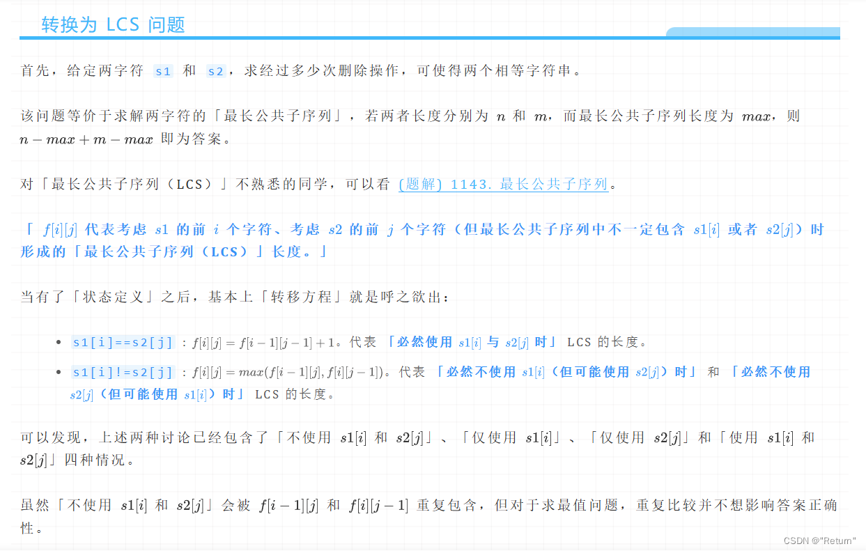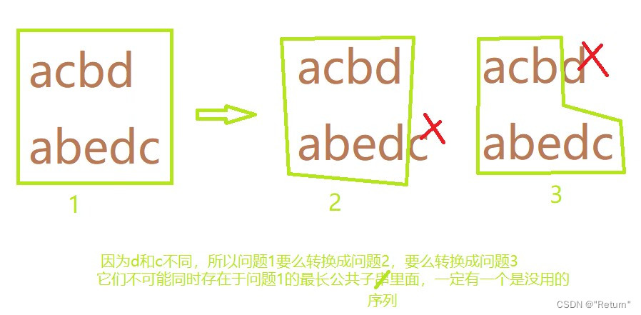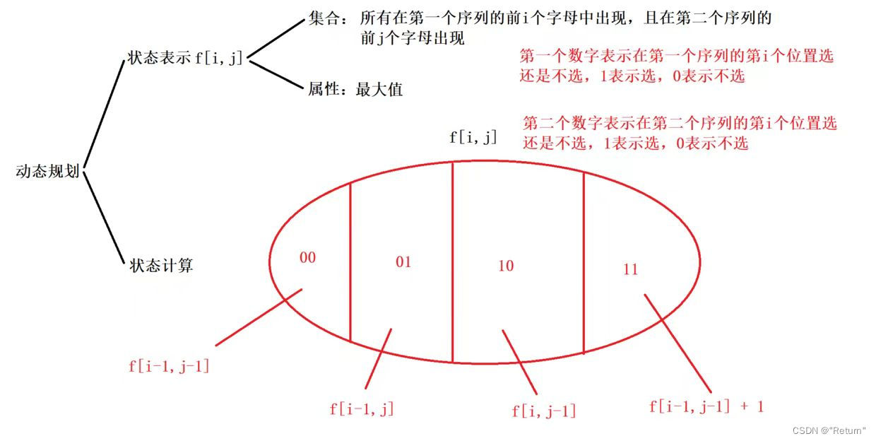 如果两个字符相等,就可以直接转移到f[i-1][j-1],不相等的话,两个字符一定有一个可以抛弃,可以对f[i-1][j],f[i][j-1]两种状态取max来转移。