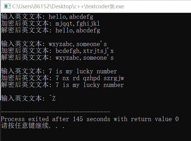 1 #include "textcoder.hpp" 2 #include <iostream> 3 #include <string> 4 int main() 5 { 6 using namespace std; 7 8 string text, encoded_text, decoded_text; 9 10 cout << "输入英文文本: "; 11 while (getline(cin, text)) 12 { 13 encoded_text = TextCoder(text).encoder(); // 这里使用的是临时无名对象 14 cout << "加密后英文文本:\t" << encoded_text << endl; 15 16 decoded_text = TextCoder(encoded_text).decoder(); // 这里使用的是临时无名对象 17 18 cout << "解密后英文文本:\t" << decoded_text << endl; 19 cout << "\n输入英文文本: "; 20 } 21 }
