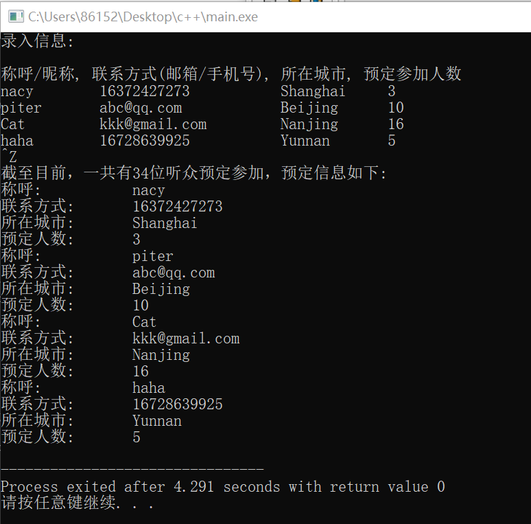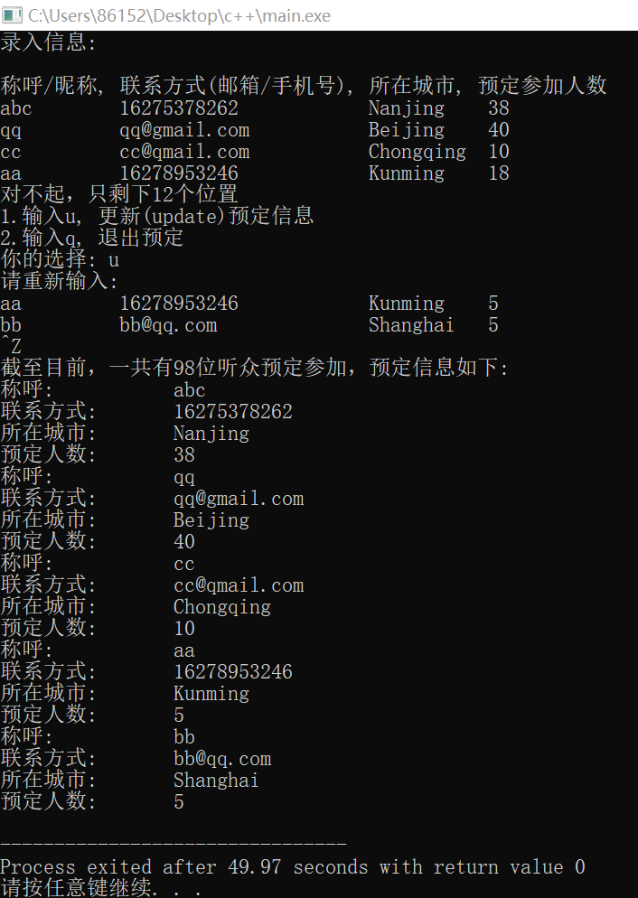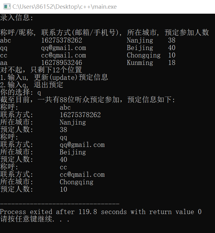 1 #include "info.hpp" 2 #include <iostream> 3 #include <string> 4 #include<vector> 5 #include "info.hpp" 6 7 using namespace std; 8 9 int main() 10 { 11 cout << "录入信息:\n\n"; 12 cout << "称呼/昵称, " << "联系方式(邮箱/手机号), " << "所在城市, " << "预定参加人数" << endl; 13 14 string nickname, contact, city, p; 15 int n, count = 0; 16 const int capacity = 100; 17 vector<info>audience_info_list; 18 19 while(cin >> nickname) 20 { 21 cin >> contact >> city >> n; 22 count += n; 23 24 if(count > capacity) 25 { 26 cout << "对不起,只剩下" << capacity - count + n << "个位置" << endl;; 27 cout << "1.输入u,更新(update)预定位置" << endl; 28 cout << "2.输入q,退出预定" << endl; 29 cout << "你的选择: "; 30 cin >> p; 31 32 if(p == "u") 33 { 34 count -= n; 35 cout << "请重新输入: " << endl; 36 } 37 else if(p == "q") 38 { 39 count -= n; 40 break; 41 } 42 } 43 else 44 { 45 audience_info_list.push_back(info(nickname, contact, city, n)) ; 46 } 47 } 48 49 cout << "截至目前,一共有" << count << "位听众预定参加。预定听众信息如下: " << endl; 50 51 for(auto it = audience_info_list.begin(); it != audience_info_list.end() ; ++it ) 52 (*it).print(); 53 54 return 0; 55 }