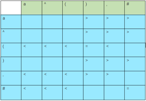 FirstVT(T)={ , ,a, ^ , ( }