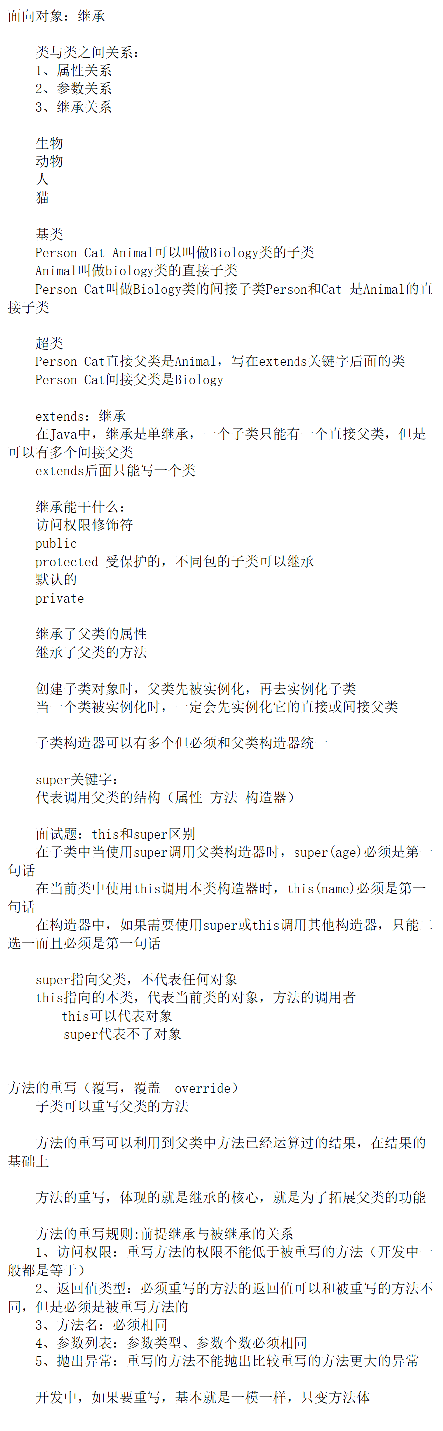 public class Ch01 { public static void main(String[] args) { Biology biology=new Biology(); biology.age=20; biology.breath(); Animal animal=new Animal(); animal.age=3; animal.breath(); Person person=new Person(); person.age=30; person.name="ll"; person.eat(); person.breath(); } } package com.jsoft.morning; public class Biology { Integer age; public Biology() { } public Biology(Integer age) { this.age = age; System.out.println("生物类的构造器..."); } public void breath(){ } } package com.jsoft.morning; public class Animal extends Biology { String name; public Animal() { } public Animal(Integer age) { super(age); System.out.println("动物类的构造器..."); } public Animal(Integer age,String name) { super(age); // this(age); this.name = name; // this(name); } // public Animal(String name){ // this.name = name; // } public void eat(){ // 调用父类的属性 age = 20; // 调用父类的方法 breath(); // 调用当前类的属性 name = "z"; // 调用当前类的方法 // drank(); } public void drank(String water) { System.out.println("动物在喝" + water); } public String show() { return "我们很优秀"; } public Biology info(Biology biology) { return null; } } package com.jsoft.morning; public class Cat extends Animal { public Cat(Integer age) { super(age); } } package com.jsoft.morning; public class Person extends Animal { public Person() { } public Person(Integer age) { super(age); System.out.println("人类的构造器..."); } public void drank(String water){ System.out.println("人在喝" + water); System.out.println("喝完了" + water + "再来一杯!"); } public String show(){ // 返回的是我们很优秀,我们很直溜 return super.show() + "我们很直溜"; } public Animal info(Biology animal){ return null; } }