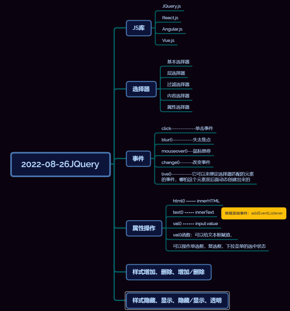 <style> .a{ width: 200px; height: 200px; background-color: orange; } .f { color: red; font-size: 50px; } </style> </head> <body> <button id="addStyle">添加样式</button> <button id="delStyle">删除样式</button> <button id="toggleStyle">添加 / 删除样式</button> <div id="div1">123123</div> <script src="js/jquery-1.9.1.js"></script> <script> $(()=> { $("#addStyle").click(() => { $("#div1").addClass("a f"); }); $("#delStyle").click(() => { $("#div1").removeClass("a f"); }); $("#toggleStyle").click(() => { $("#div1").toggleClass("a f"); }); }) </script> </body>