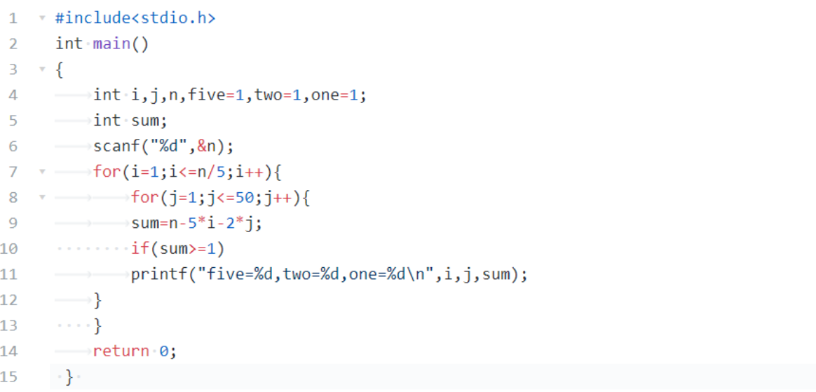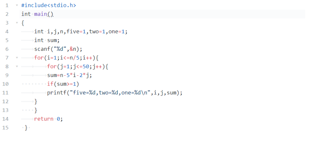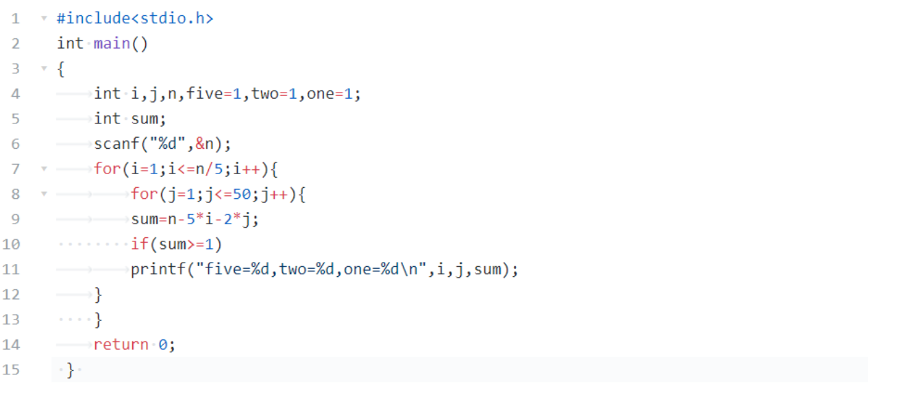 数据处理:运用了for的多循环结构表达式:sum=n-5*i-2*j