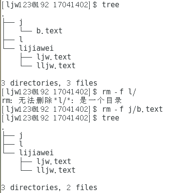 7、把当前目录的第一个子目录中的文件ljw.txt复制到第二个子目录中,然后再次把第一个子目录中的ljw.text复制到第三个子目录并命名为b.text,最后把第一个子目录中的文件ljw.text重命名为a.text。通过tree命令查看当前目录情况。