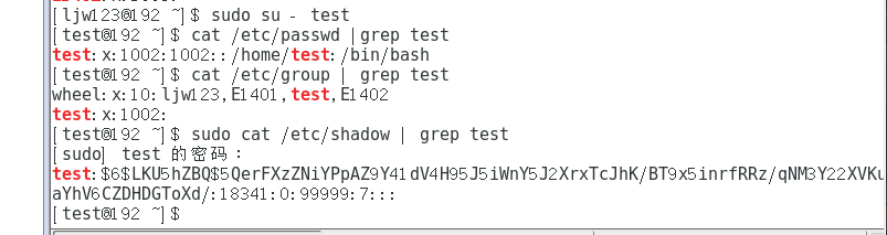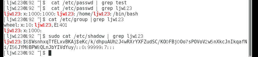 cat /etc/passwd | grep ljw123 #查看/etc/passwd文件,并将含有ljw123出现的行显示出来