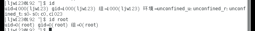 ljw123用户的uid号码为1000,gid号码为1000,所处环境为unconfined_u:unconfined_r:unconf。