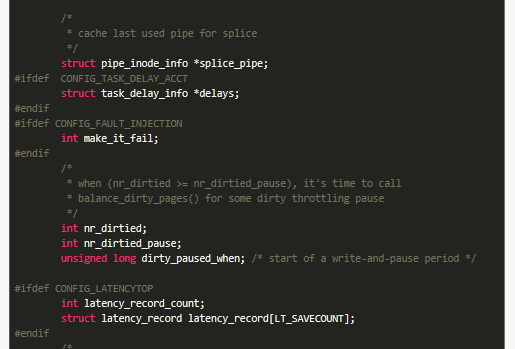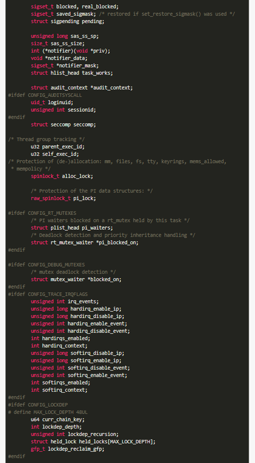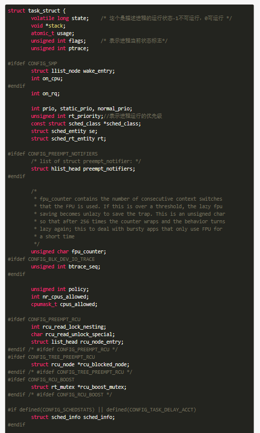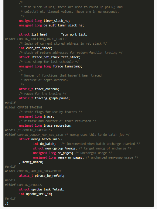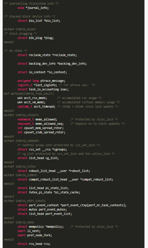 2019-09-24 17:57 老九君 阅读(705) 评论(0) 收藏 举报waring:标题党前言:点进来的小伙伴可能是为了看看结构体的长度的,当然不会让大家失望的,整个复制下来贴在下面了,另外学习C语言的方法无非就是多写多看,看优秀的demo,下面的故事从一个结构体开始,这个结构体选自Linux3.5版本,在/include/linux/sched.h里面,