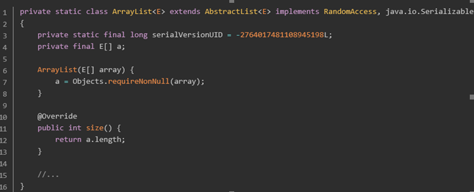 这个内部类也叫 ArrayList,更重要的是在这个内部类中有一个被声明为 final 的数组 a,所有传入的元素都会被保存在这个数组a中。到此,谜底又揭晓了: asList 方法返回的确实是一个 ArrayList ,但这个 ArrayList 并不是java.util.ArrayList,而是 java.util.Arrays的一个内部类。这个内部类用一个 final 数组来保存元素,因此用 asList 方法产生的 ArrayList是不可修改大小的。