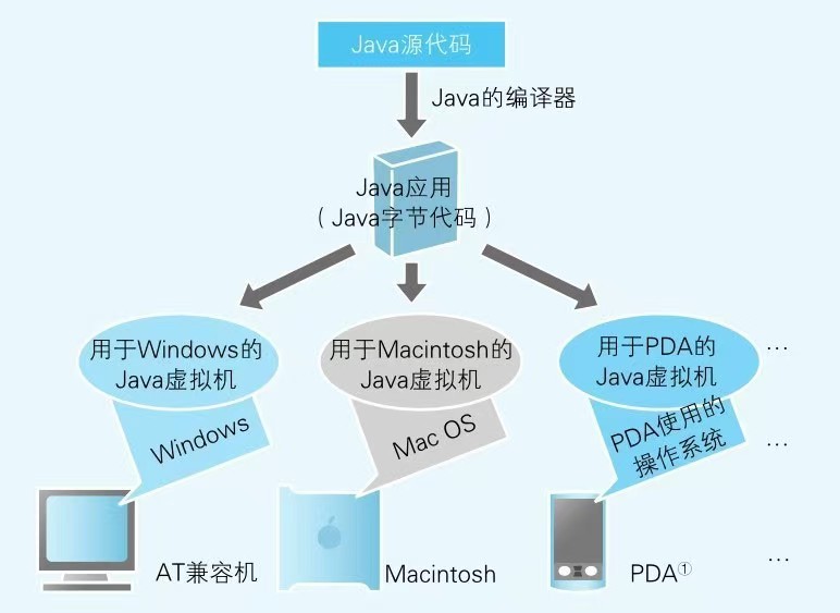 一个是作为编程语言的Java,另一个是作为程序运行环境的Java。同其他编程语言相同,Java也是将Java语法记述的源代码编译后运行。不过,编译后生成的并不是特定CPU使用的本地代码,而是名为字节代码的程序。字节代码的运行环境就称为Java虚拟机(JavaVM, Java VirtualMachine)。Java虚拟机是一边把Java字节代码逐一转换成本地代码一边运行的。