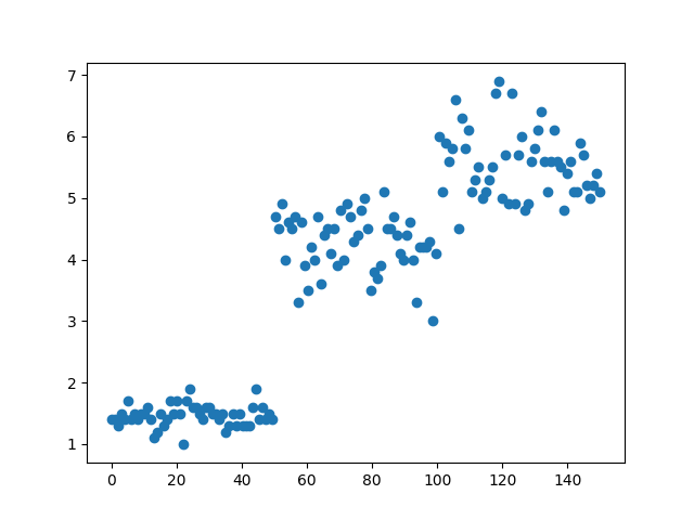 plt.scatter(np.linspace(0,150,num=150),petal_len,marker='o')#花瓣图