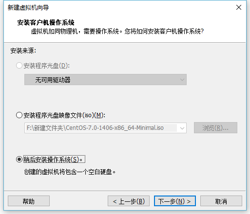 这里我们一定要选择稍后安装操作系统,VMware比较智能,如果你把iso指定之后,会自动给你安装,但是安装的一些操作可能并不是你想要的。