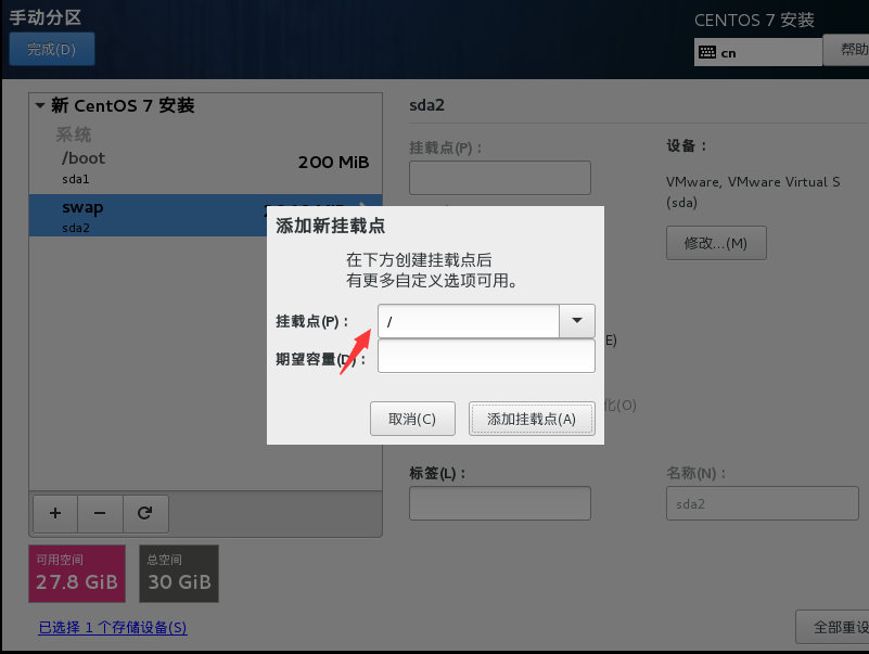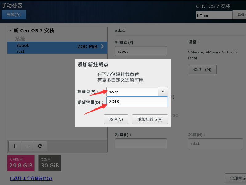 (7)新建swap分区,大小为虚拟机内存的2倍,实际服务器中,内存大于4G 就分swap为8G。