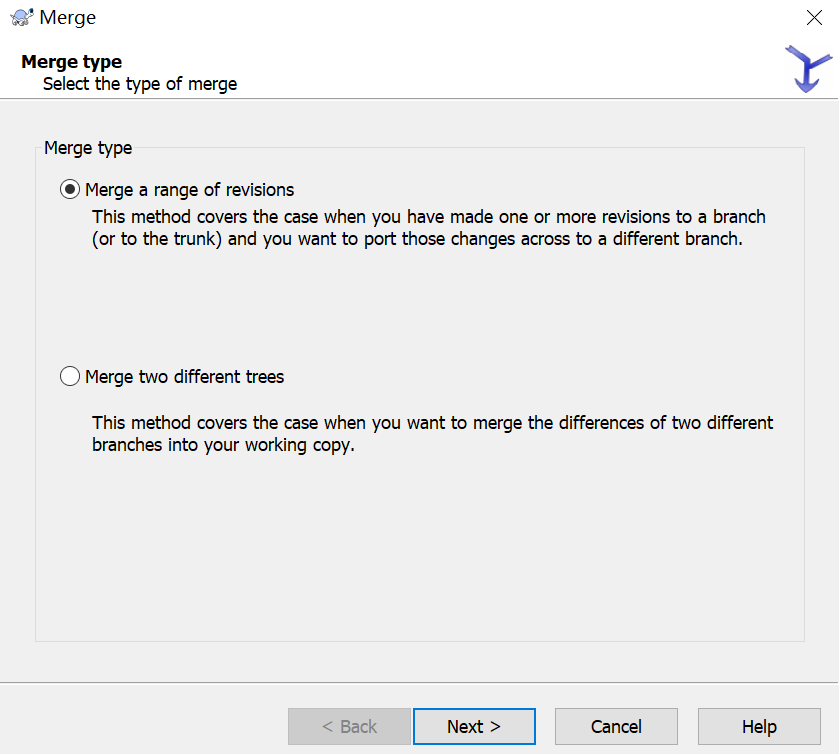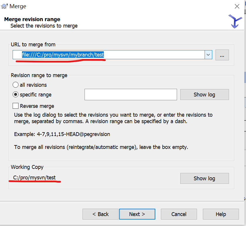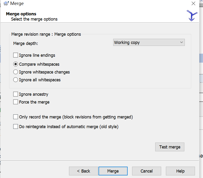 working copy 表示你要将合并到哪个分支还是主干上。(图中是将分支合并到trunk)