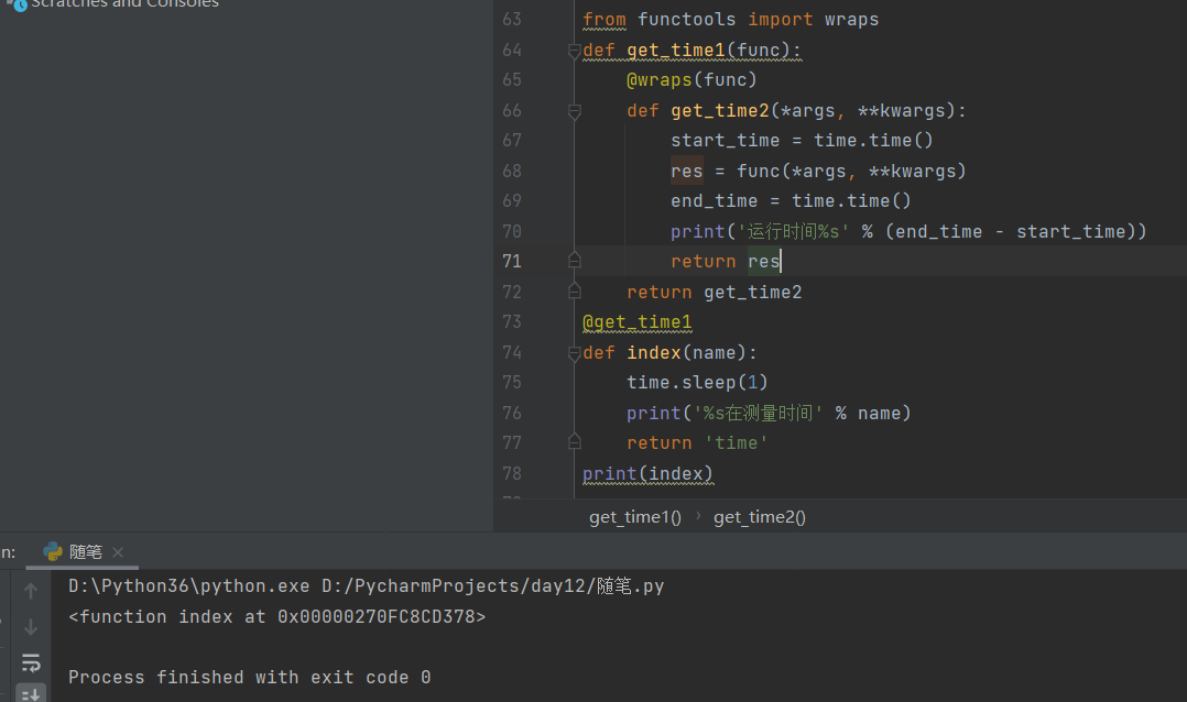 def more(another): from functools import wraps def get_time1(func): @wraps(func) def get_time2(*args, **kwargs): start_time = time.time() res = func(*args, **kwargs) end_time = time.time() print('运行时间%s' % (end_time - start_time)) print('需要一个外层参数%s' % another) return res return get_time2 return get_time1 @more('示例') def index(name): time.sleep(1) print('%s在测量时间' % name) return 'time' index('tom')