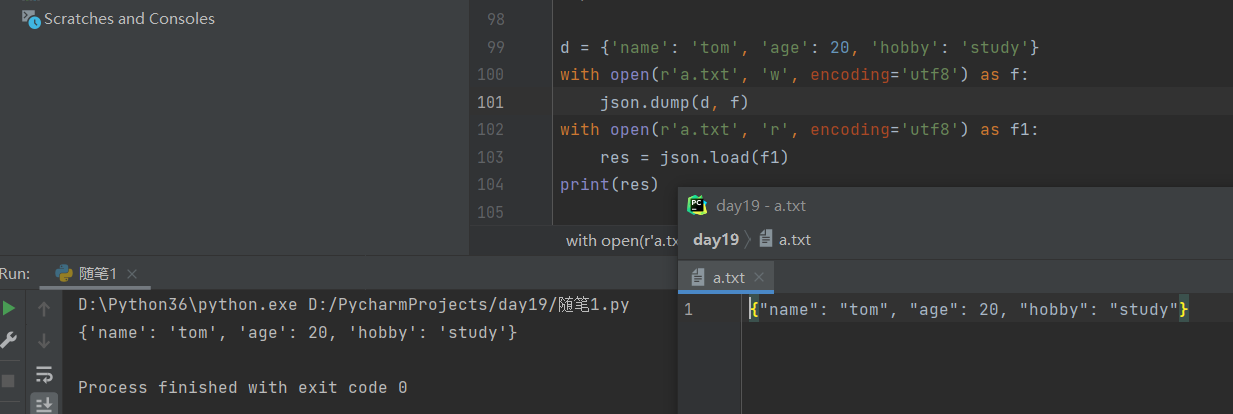 dump方法提供了一种简单的将数据转为json格式字符串然后写入字典的方法。