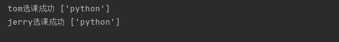 def choose_course(stu_dict, course): stu_dict['course'].append(course) print('%s选课成功 %s' % (stu_dict['name'], stu_dict['course'])) # 学生作为对象 stu1 = { # 将姓名等作为特征 'name': 'tom', 'age': 18, 'gender': 'male', 'course': [], # 将选课的函数作为技能 'choose_course': choose_course } # 学生作为对象 stu2 = { # 将姓名等作为特征 'name': 'jerry', 'age': 18, 'gender': 'male', 'course': [], # 将选课的函数作为技能 'choose_course': choose_course } # 调用函数将自身作为参数传入 stu1['choose_course'](stu1, 'python') stu2['choose_course'](stu2, 'python')