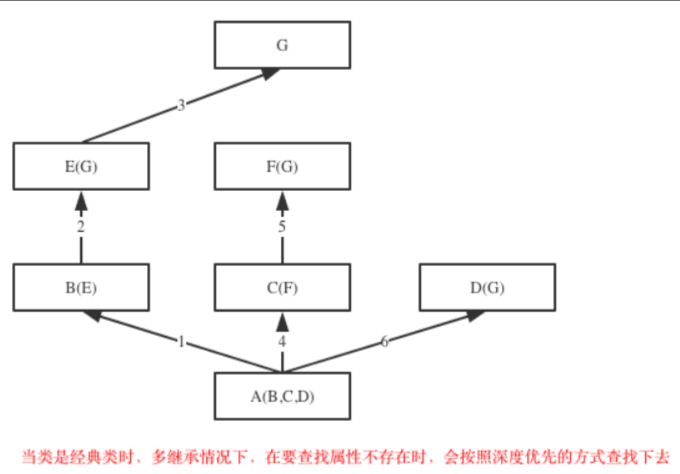 在多继承时,经典类会一次性查到底,然后才去第二个父类找。