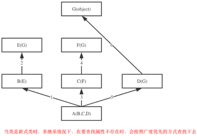 在多继承时,新式类在查到继承object类的父类时会先不查,直到没有其他父类才会去查询。
