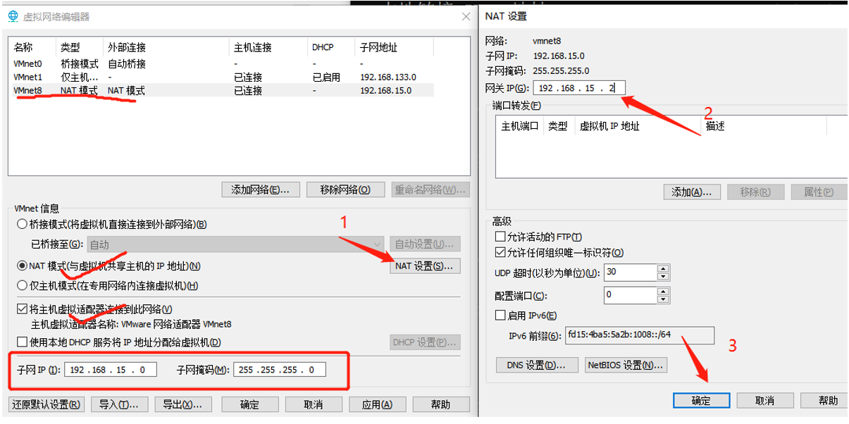 打开VMware,在编辑中选择虚拟网络编辑器,点击更改设置(需要管理员权限),之后将设置改成与下图相同。